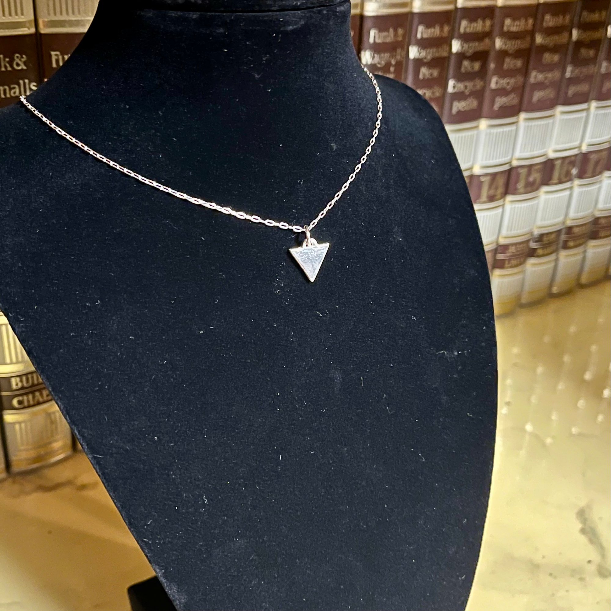 Handmade sterling silver inverted triangle pendant on 18” sterling silver cable chain. Pendant is approximately 12mm tall, about half an inch.